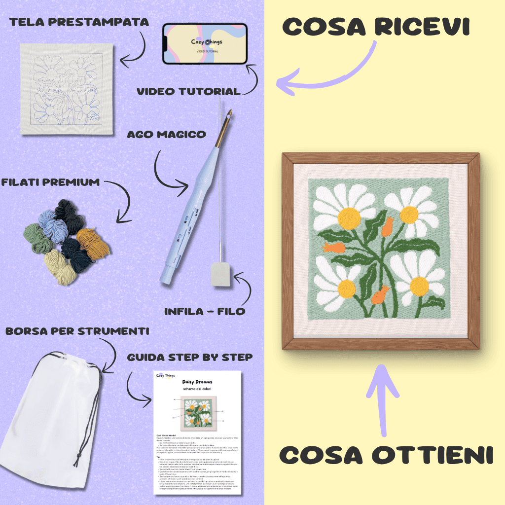 Più semplice di quanto immagini. Se sai tenere una penna, sai fare punch needle. È UN movimento ripetuto: pungi, tiri, ripeti. I disegni sono già prestampati, tu segui solo le linee. In 5 minuti hai capito tutto, poi è puro relax automatico.